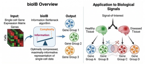 To address this challenge, we developed bioIB, a computational method based on the Information Bottleneck algorithm*, that seeks to extract from single-cell data the most relevant information to a particular biological signal or process. Given a signal of interest – for example, annotations of cells to different types or originating from healthy vs. diseased tissues – bioIB generates a compact, interpretable representation of the data, highlighting only the meaningful biological differences related to the signal of interest. Beyond simplifying the data, bioIB also reveals how these gene groups relate to one another, uncovering connections between biological processes and cell types.