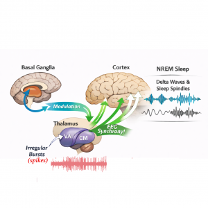 This study challenges two longstanding paradigms in systems neuroscience regarding interactions among the cortex, the basal ganglia, and the thalamic nuclei. First, since the 1970s, the basal ganglia have been thought to influence behavior mainly by inhibiting thalamic activity. We demonstrate that, at least during natural sleep, the basal ganglia do not simply drive their thalamic targets but instead modulate thalamic activity. Second, it has been widely proposed that thalamic burst firing during non-REM (NREM) sleep fails to wake the cortex because the bursts are periodic and highly synchronized, effectively carrying a “null” message. In contrast, our recordings during natural sleep reveal that NREM thalamic bursts (figure-spikes) are neither periodic nor tightly synchronized. Rather than intrinsic burst synchrony preventing arousal, we show that state-dependent thalamocortical dynamics—specifically cortical delta and spindle activity aligned to thalamic bursts—are sufficient to explain why these bursts do not awaken the cortex. Together, our findings suggest that during sleep, the basal ganglia modulate thalamic activity and that sleep stability is maintained by coordinated thalamocortical network dynamics rather than by periodic synchrony of thalamic bursting.